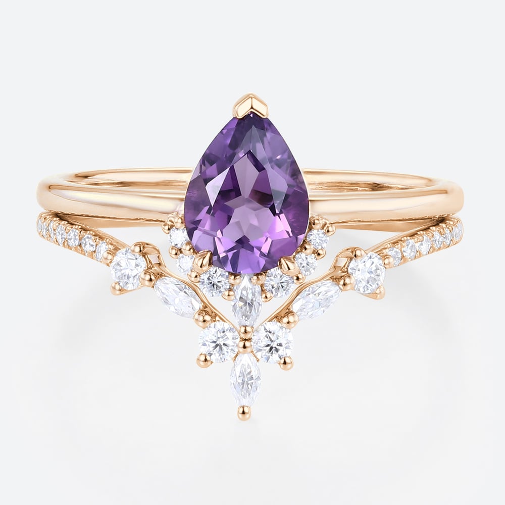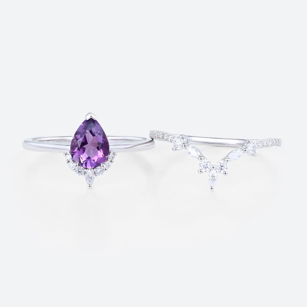 White Gold Pear Shaped Amethyst Engagement Ring with Moissanite Curved Wedding Ring Set