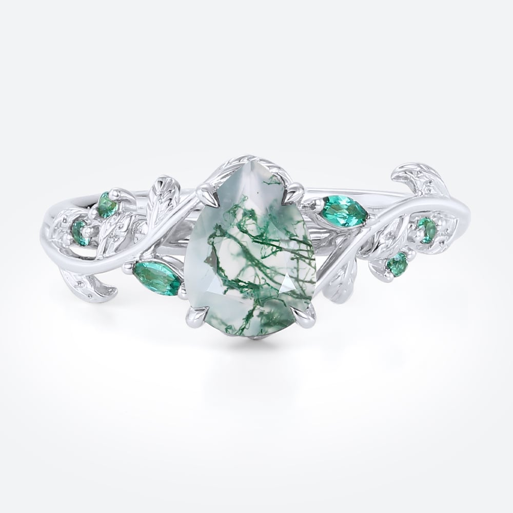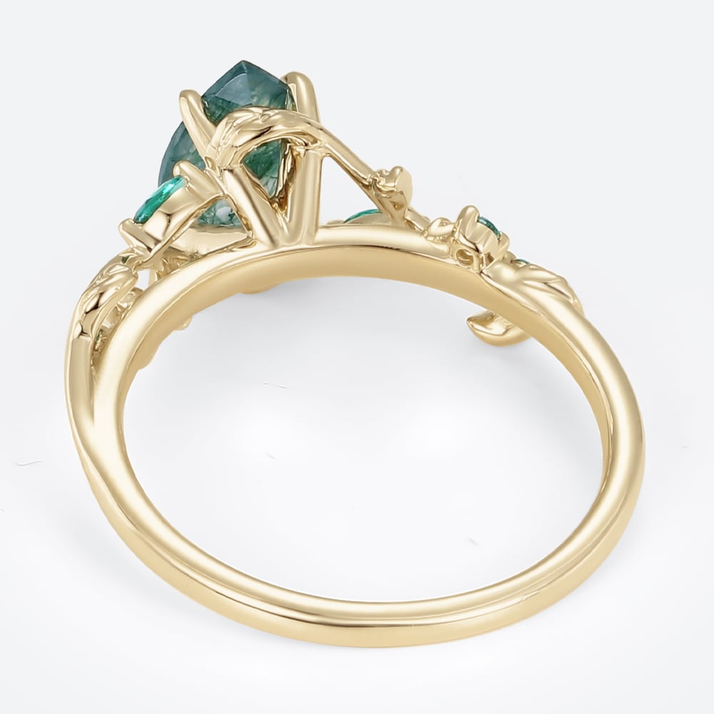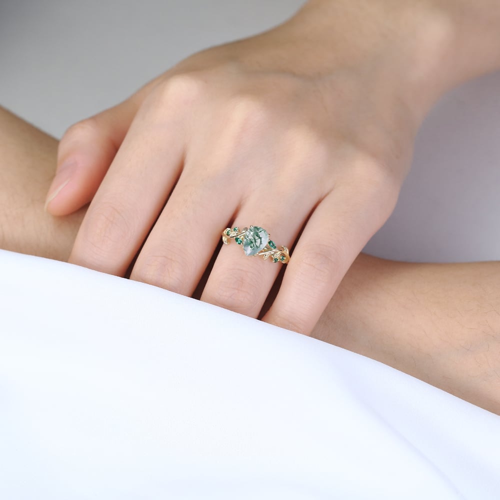 Pear Shaped Moss Agate Nature-Inspired Engagement Ring with Emerald Accents in Yellow Gold