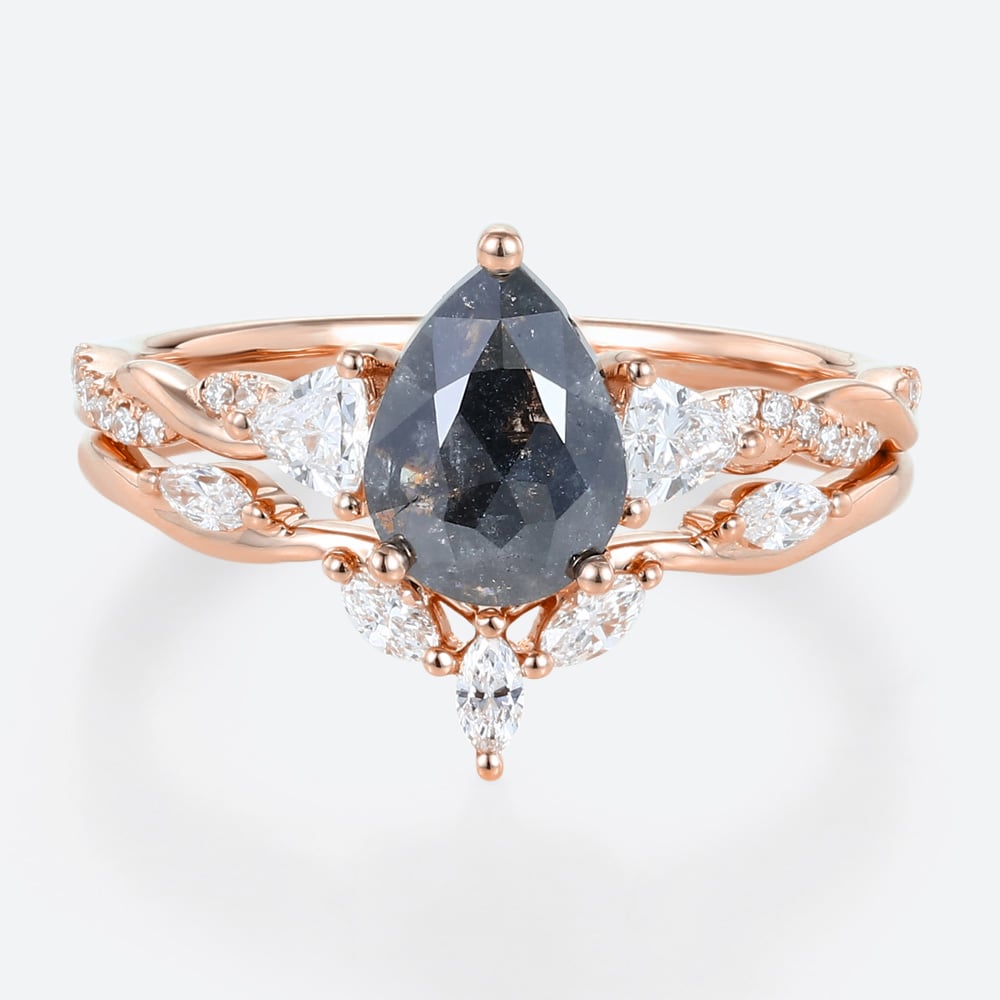 Pear Shaped Salt and Pepper Diamond Bridal Ring Set Crossover Shank Engagement Ring