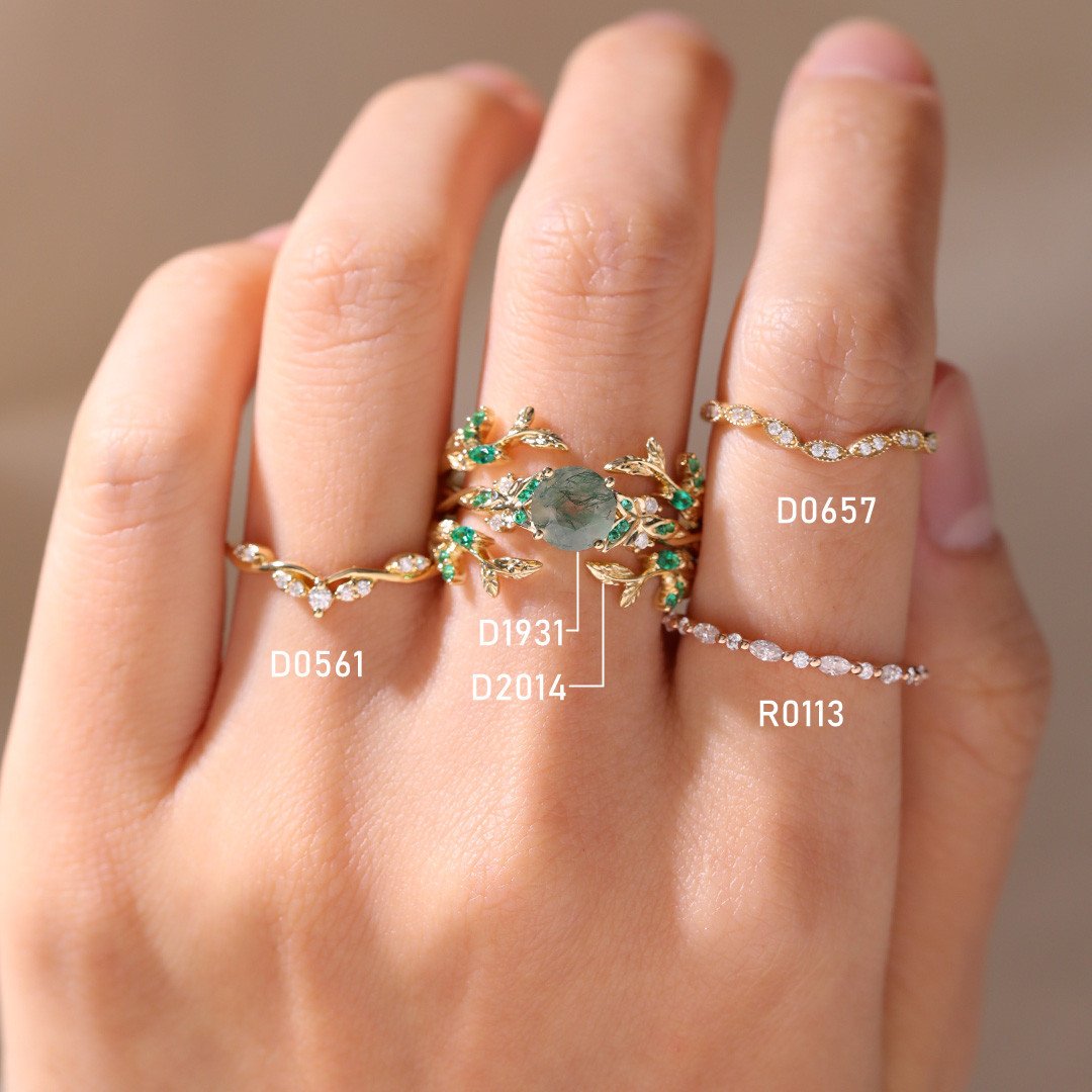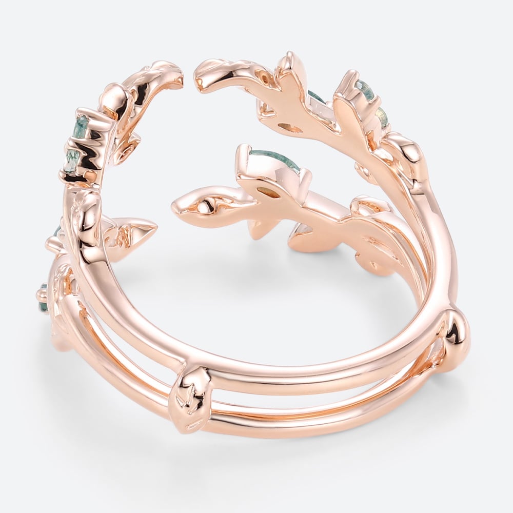Marquise & Round Cut Moss Agate Wedding Band Ring Leaf-Inspired Enhancer Band