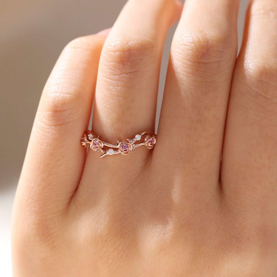 0.07ctw Round Cut Pink Sapphire Unique Wedding Band Lab Grown Diamond Floral-Inspired Stacking Ring in Rose Gold