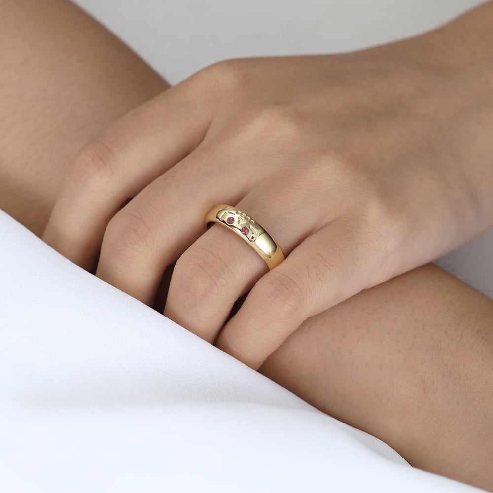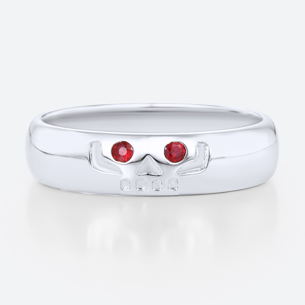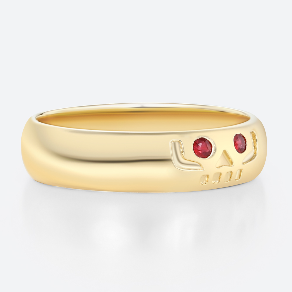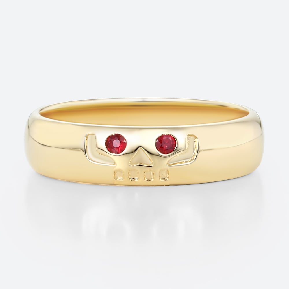 Round Cut Ruby-Eyed Wide Band Ring with Engraved Skull Design in Yellow Gold