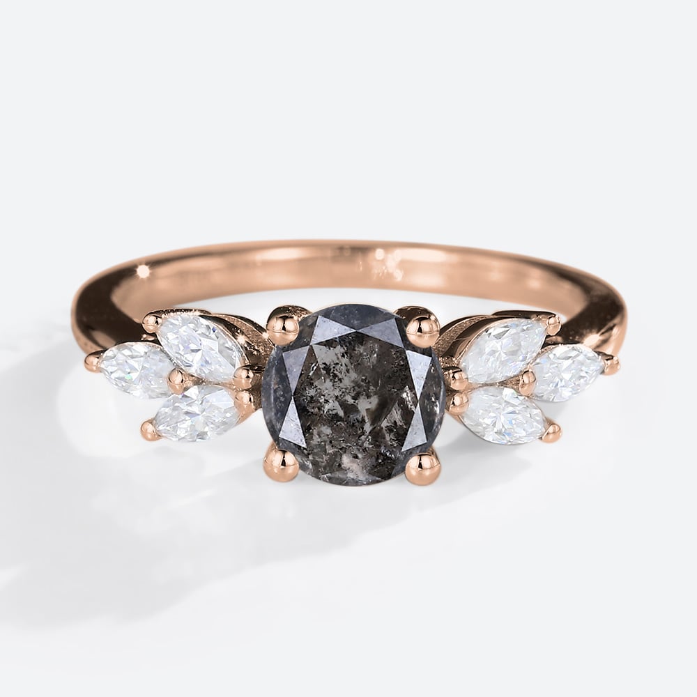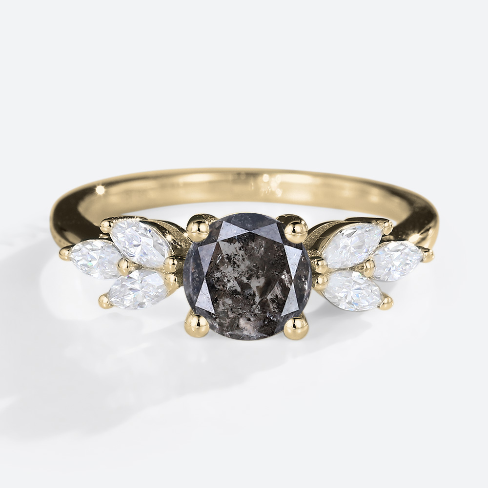 Round Cut Salt & Pepper Diamond Engagement Ring Marquise Diamond Accented Bridal Ring