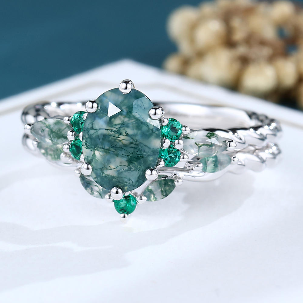 Solid White Gold Oval Shaped Moss Agate Bridal Wedding Ring Set