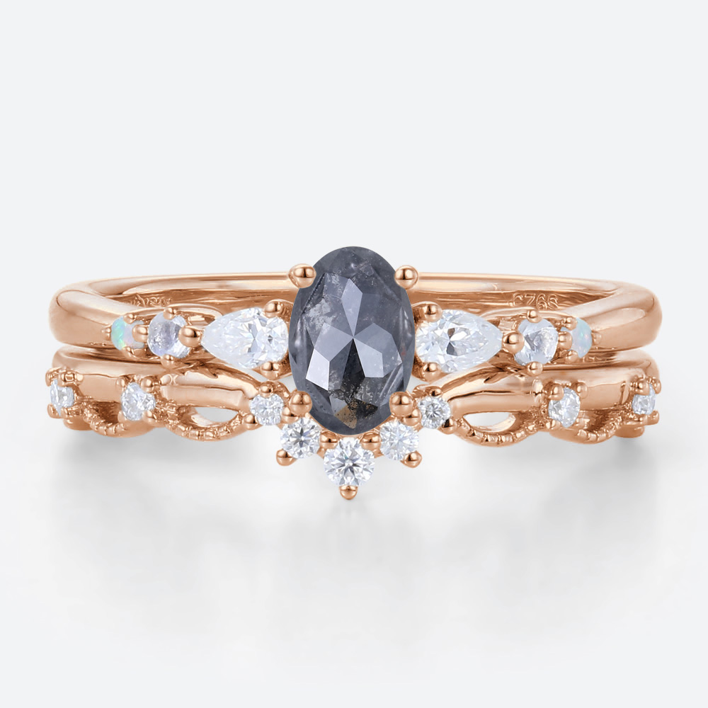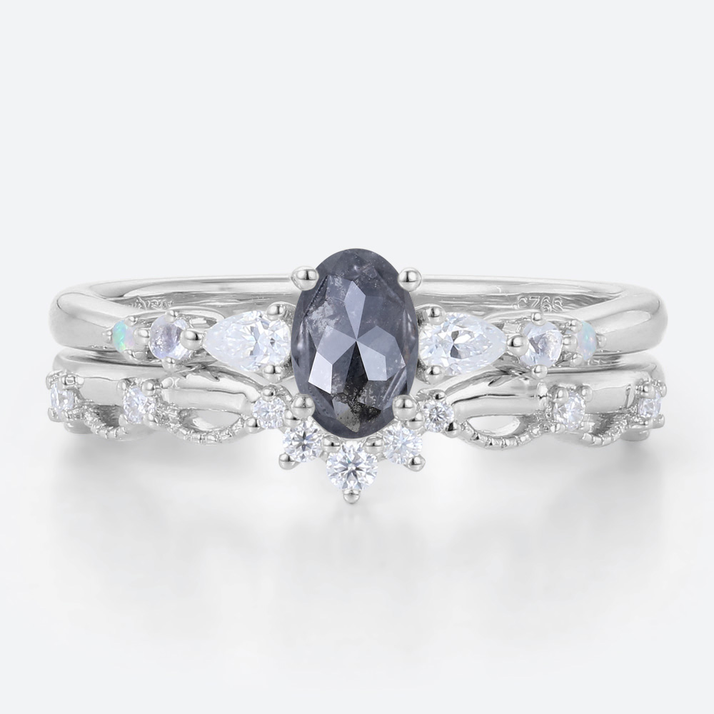 Oval Cut Salt and Pepper Diamond Ring Vintage Wedding Ring Sets