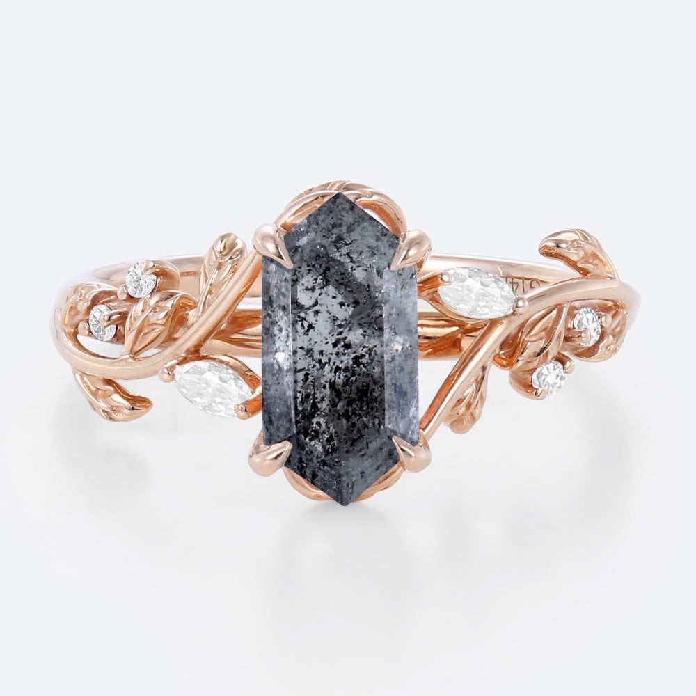 White Gold Elongated Hexagon Salt and Pepper Diamond Engagement Ring Vine Bridal Ring