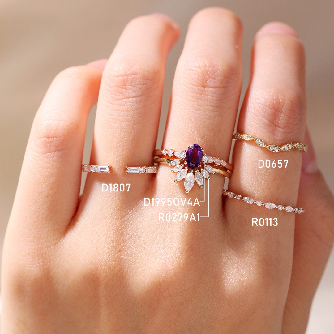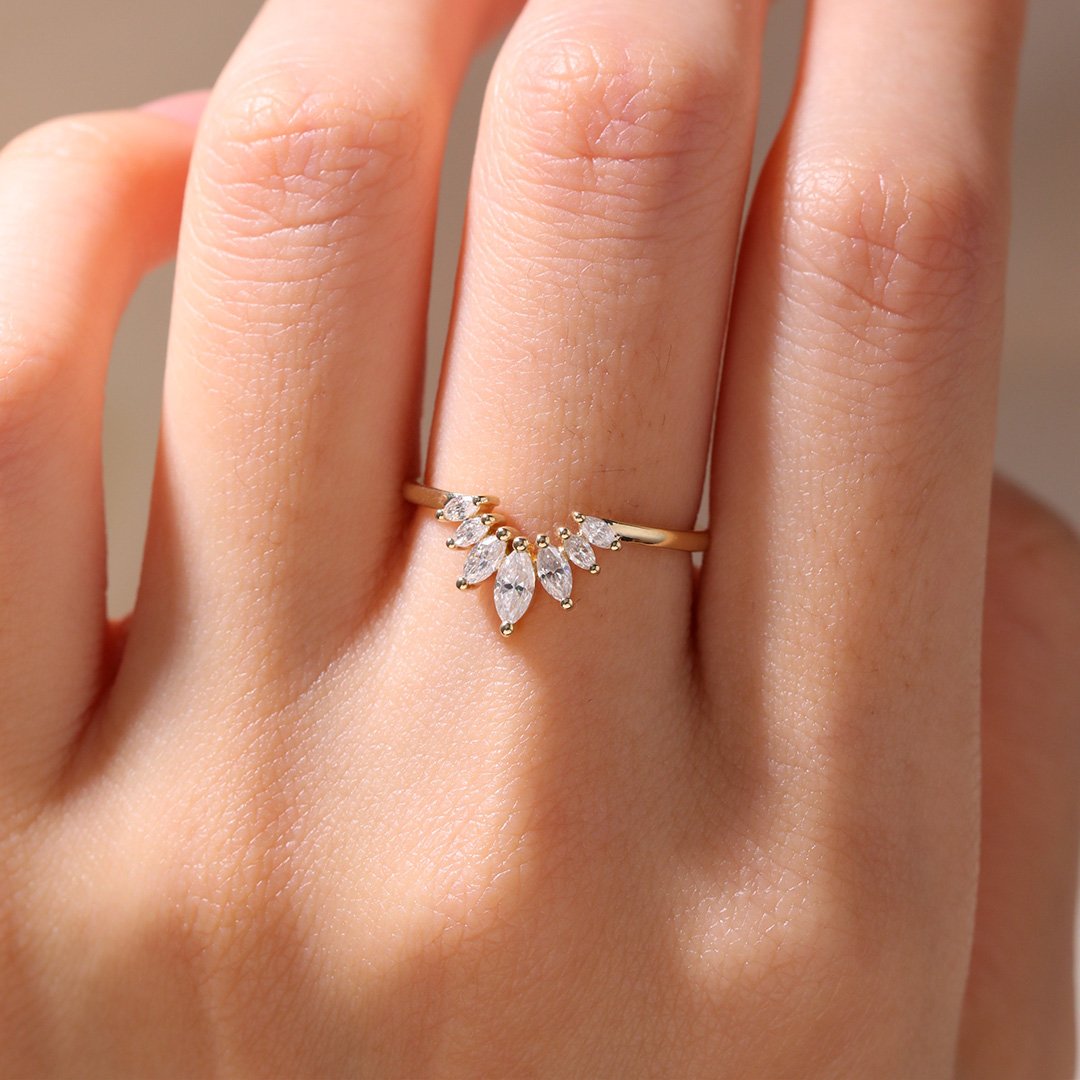 Yellow Gold Marquise Cut Moissanite Rings Curved Wedding Band Stacked Wedding Rings